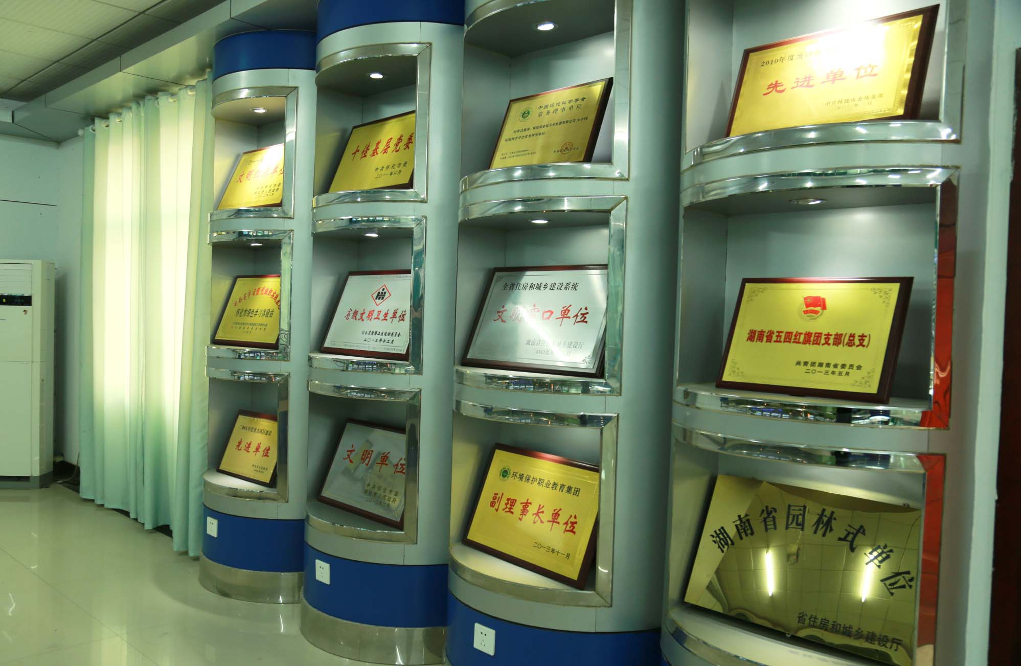 展覽廳分為四個(gè)部分,一是水環(huán)境保護(hù)的宣傳,二是平面布置實(shí)體模型,三是公司黨委歷年獲得的部分榮譽(yù)展示,四是進(jìn)出水樣。
